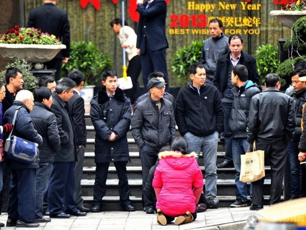 2月19日中午,长沙市八一路富丽华酒店门口,死者王某家属在酒店前讨要说法,随后被保安驱赶离开。