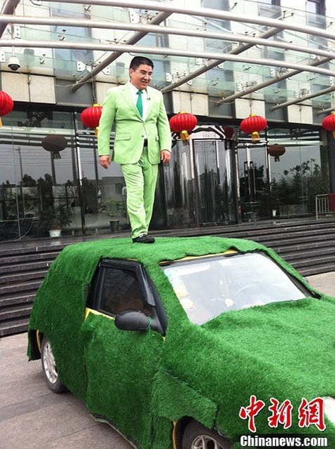 2月21日,11名来自全国各地、自称是污染企业老板聚在江苏黄埔再生资源利用有限公司董事长陈光标的公司,用“自抽嘴巴”的方式响应陈光标的环保号召,承诺将停业转行。图为陈光标站在一辆小排量汽车顶上,号召群众“只开小排量”,支持环保。