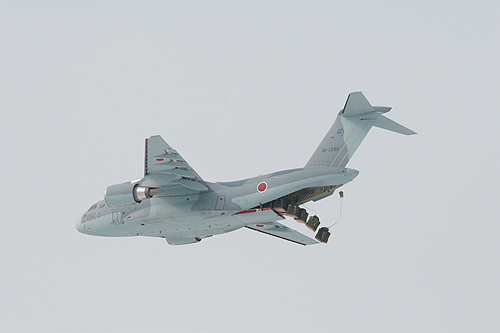技术研究本部和日本航空自卫队试飞团队从2012年2月开始,在陆上自卫队东富士山演习场上空进行连续空投集装箱和空降兵的试验;为满足国际灾害救援需要,进行了陆上自卫队UH-1直升机装载试验;冬季,在航空自卫队的千歳基地进行了耐寒试验;为应对敌机和地面的导弹威胁,进行了曳光弹齐射试验。各项试验将持续到2014年末,同时开展量产机型的生产。