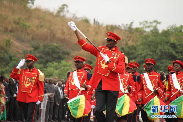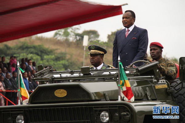 8月15日,在刚果(布)普尔省省会金卡拉,刚果(布)总统萨苏(右二)检阅部队