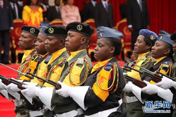 8月15日,在刚果(布)普尔省省会金卡拉,仪仗队在阅兵式上行进。