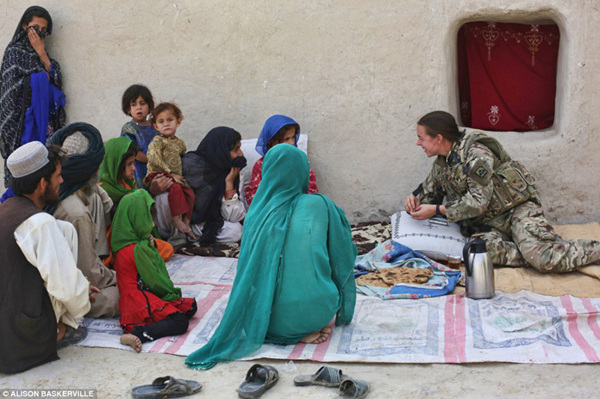 图为女兵Lieutenant French与当地居民交谈