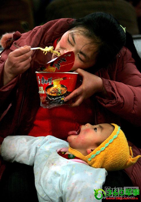 2006年1月18日,北京西客站候车室,一位母亲咬断方便面喂孩子,而她的孩子早等不及地长大了嘴巴。