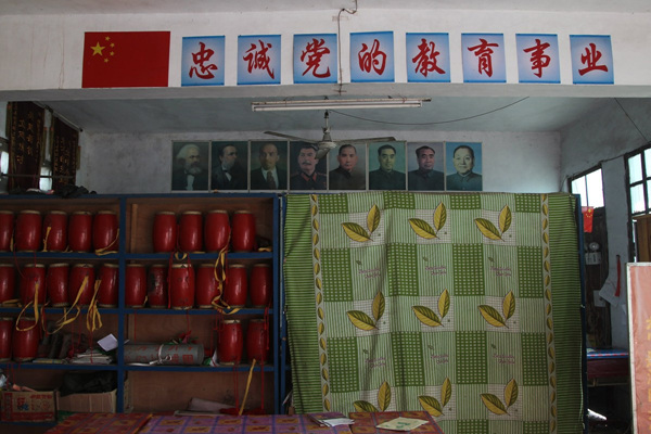 民主中小学活动室内放着音响、腰鼓等物品。