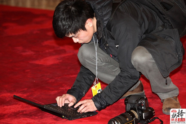 3月2日,北京,记者抢时间就地撰稿。