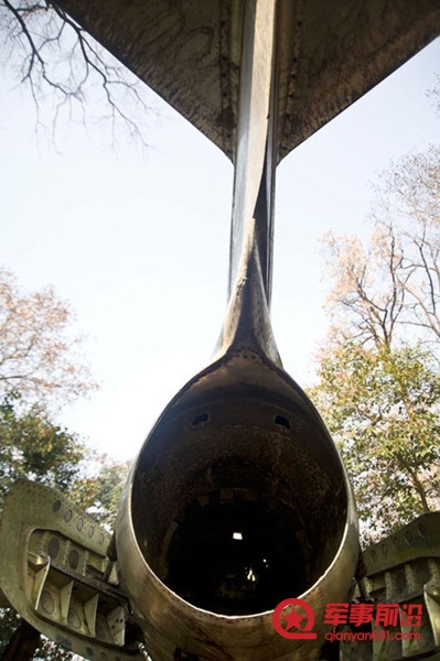 战机被安放在3个1米多高的水泥墩上。战机虽然破败不堪,从山坡下面抬头仰视战机,它还是那么雄伟壮观,依然有凌空飞翔的感觉,当年的雄风依稀可辨。